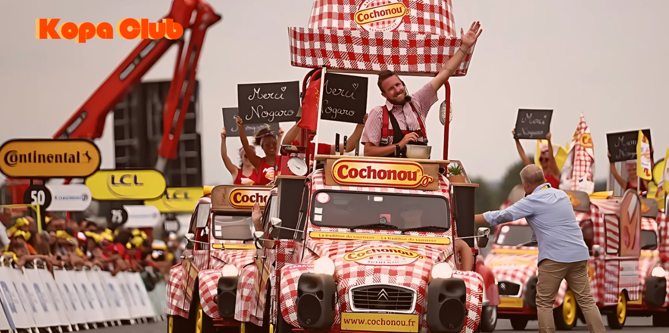 Chaque été, c’est le même manège : on vient pour voir Pogacar, on repart avec une casquette Cochonou et un paquet de madeleines écrasées. Depuis 1930, la caravane publicitaire du Tour de France précède le peloton d’environ deux heures, distribuant sourires, décibels et 12 millions d’euros de goodies. La première marque à s’élancer dans ce joyeux cirque fut La Menier, une chocolaterie française visionnaire qui comprit avant tout le monde qu’un public massé sur des routes de montagne… avait les poches libres.